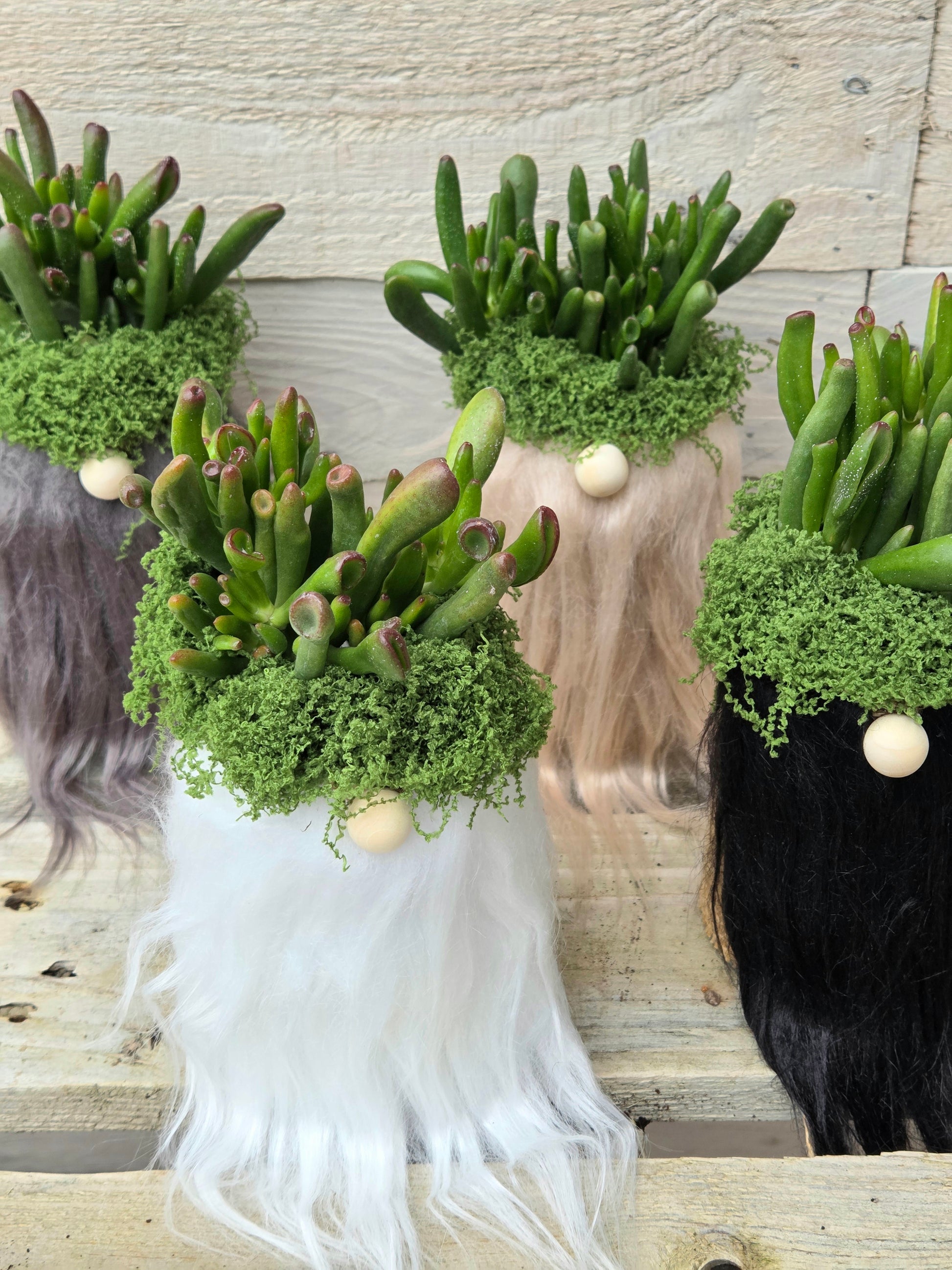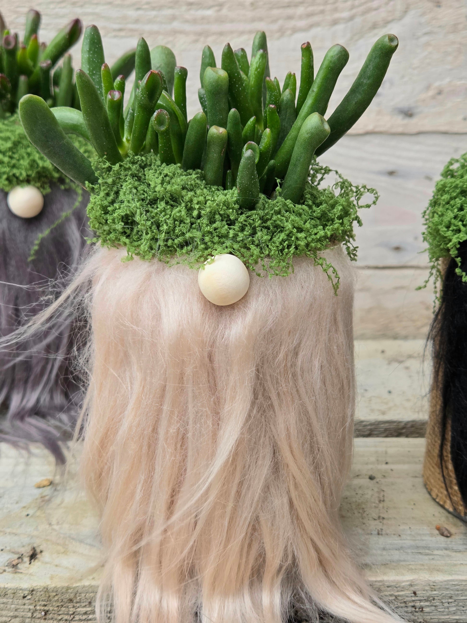A cheeky little character with chunky charm—this handmade gonk features Crassula ovata ‘Gollum’, a succulent known for its plump, tubular leaves that resemble Shrek’s iconic ears. Nestled in faux moss and styled with whimsy, it’s a joyful addition to any shelf, windowsill, or gift bundle.