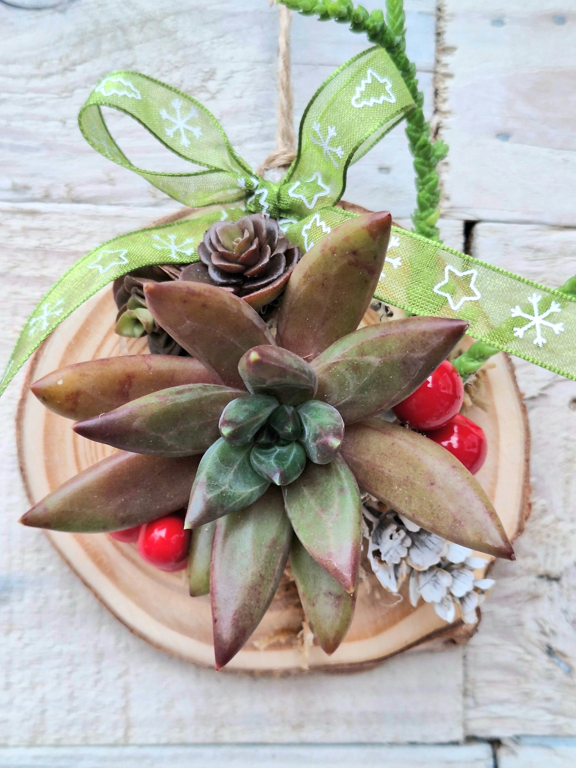 Celebrate the season with a touch of nature’s quiet magic. Each handcrafted succulent decoration is a unique miniature arrangement, nestled in soft sphagnum moss and designed to bring joy long after the holidays have passed.